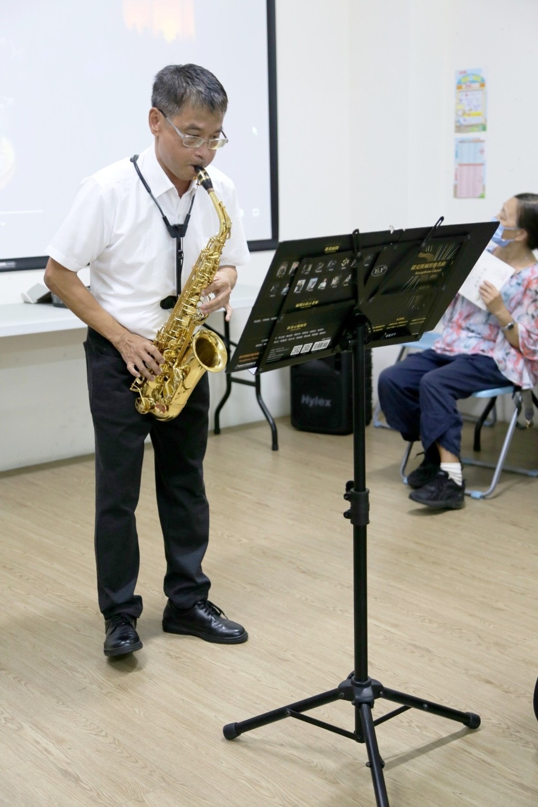 後湖社區發展協會王文祿總幹事,現場為長輩吹奏多首耳熟能詳的老歌曲。