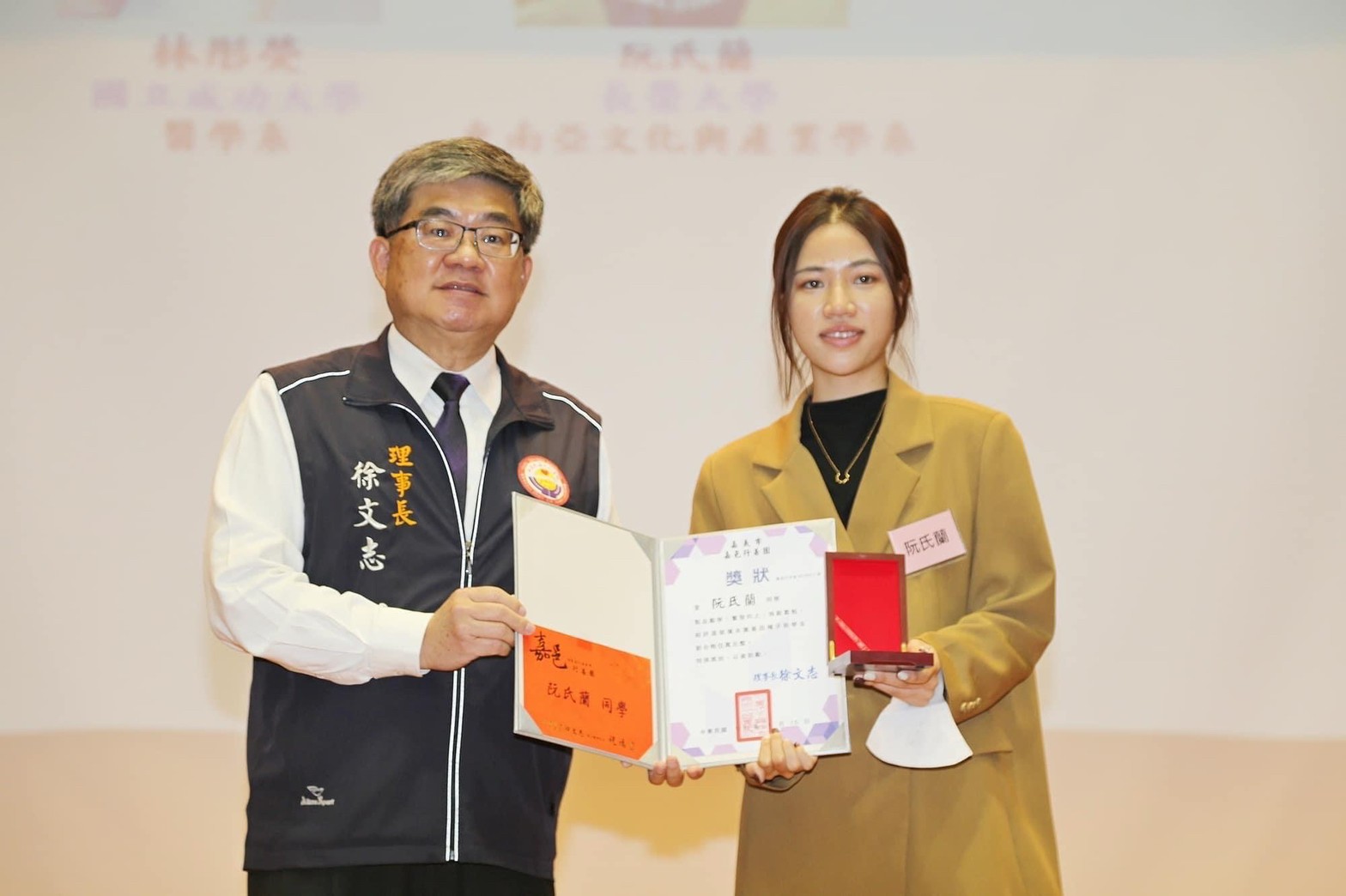 阮同學上台分享獲獎心得時,一度哽咽,14歲從越南依親來台唸書,過程十分辛苦,現在的她說「困難,只要走過了,都會變成日後的養分」。代表高雄科技大學的陳同學說,從小家境艱難,會到教會和慈濟吃愛心餐,希望自己未來有能力了,也能手心向下、影響別人生命