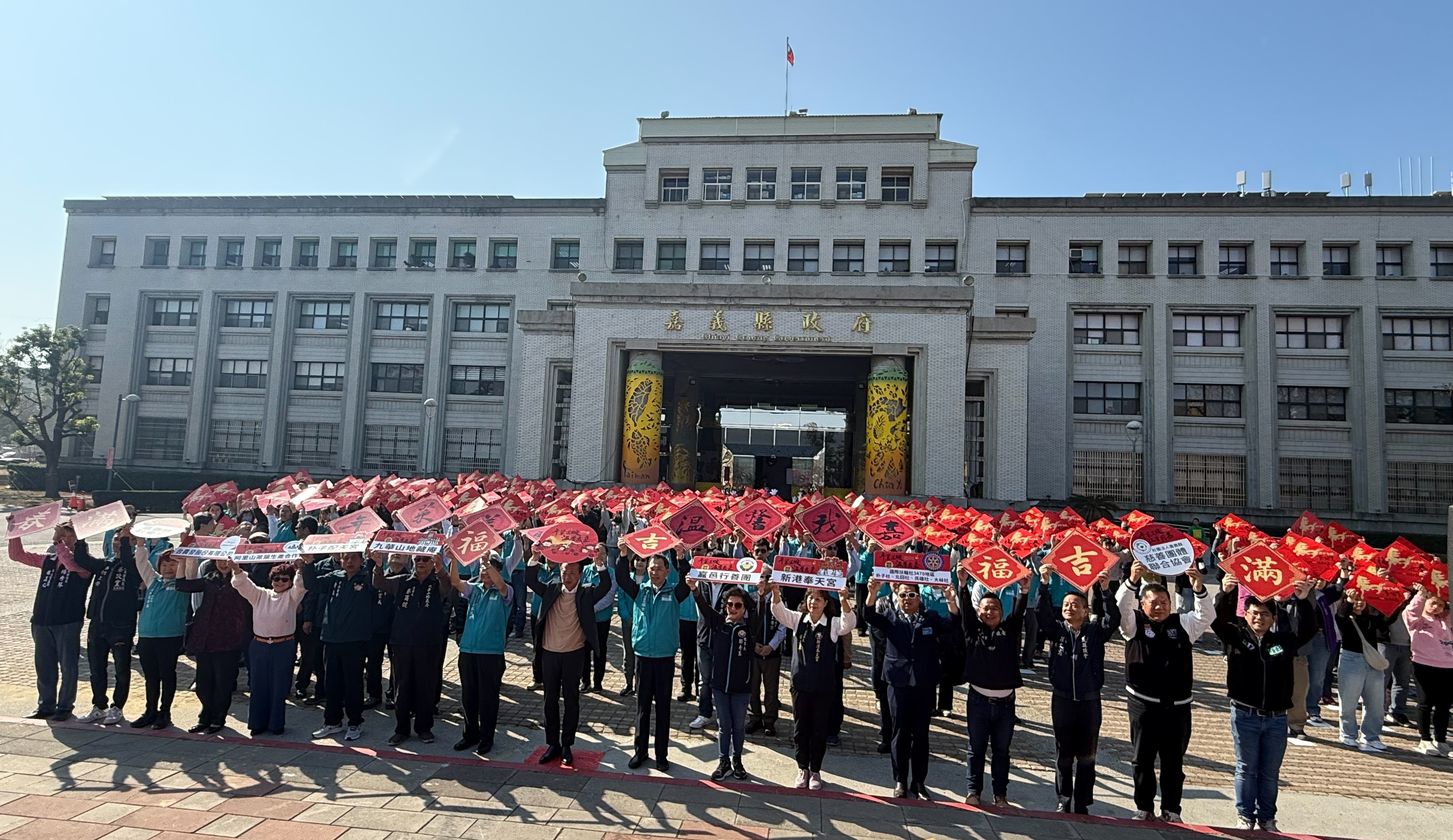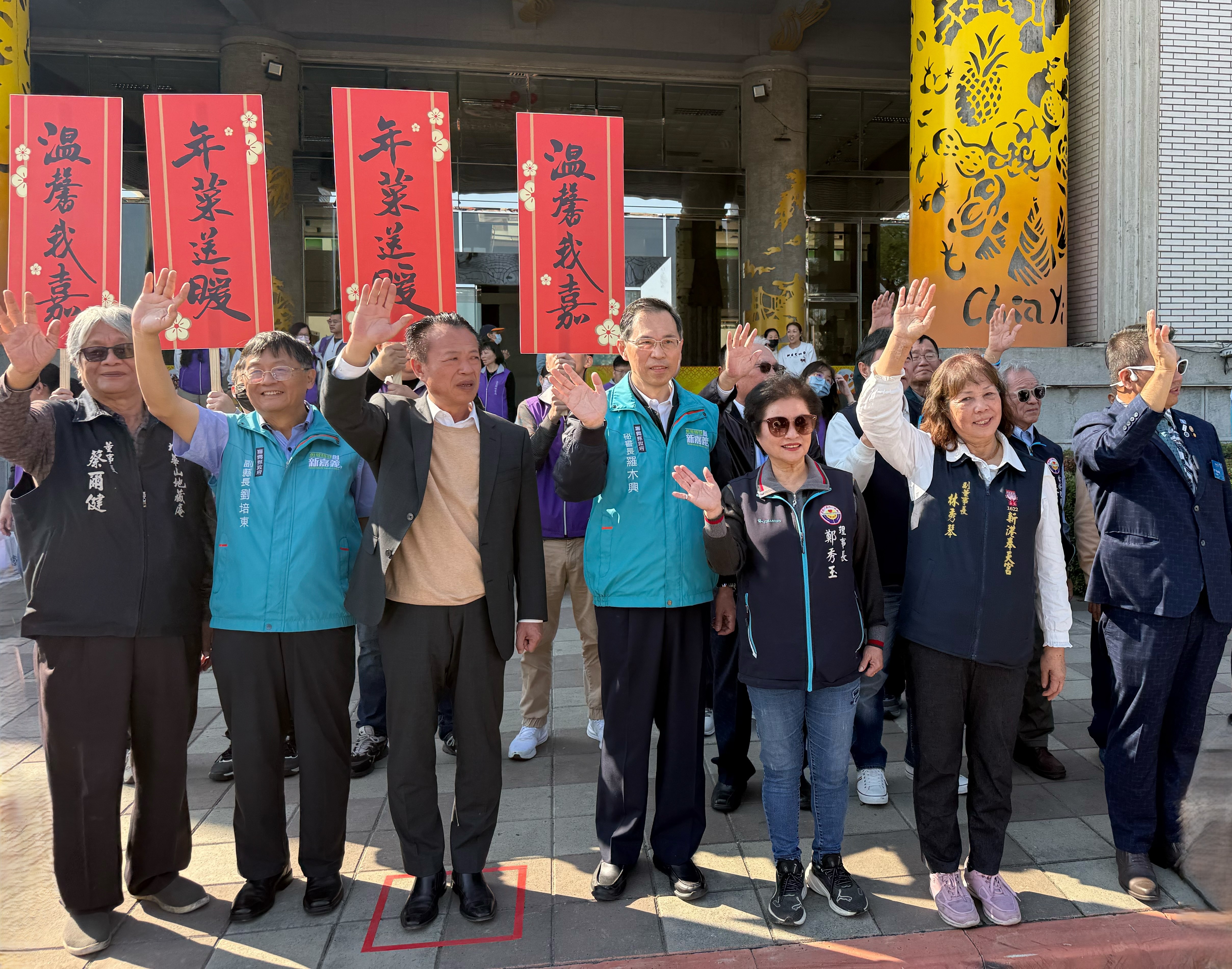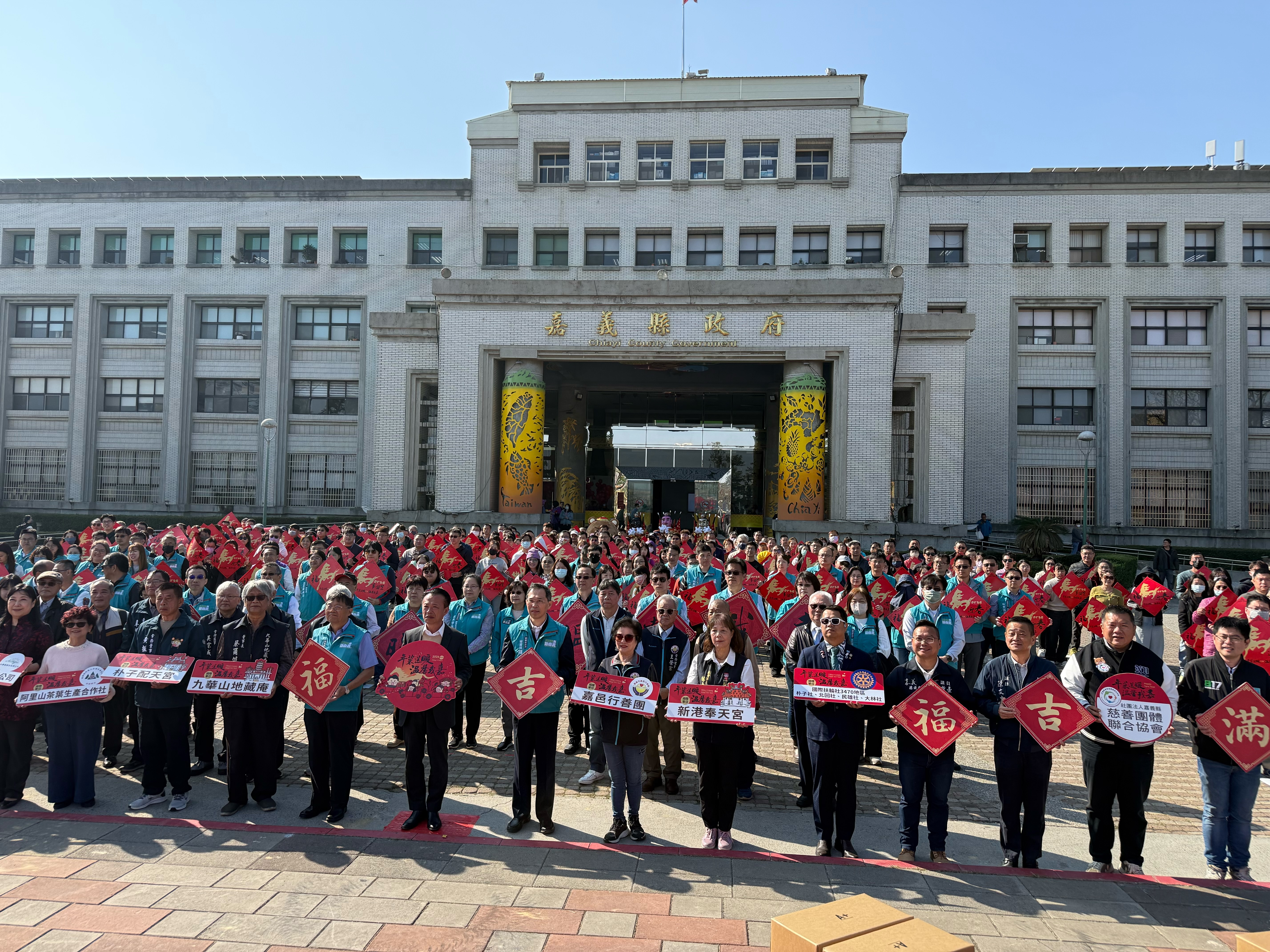 縣府於縣府前廣場舉行溫馨的出發儀式,縣府團隊化身志工,把年菜與祝福一戶戶送進家門。