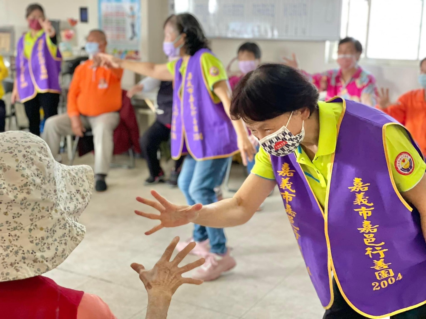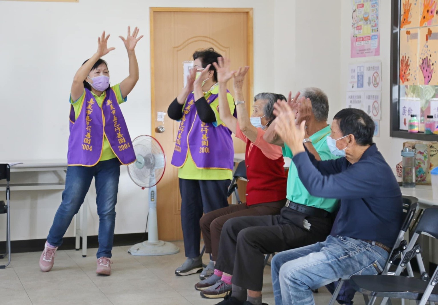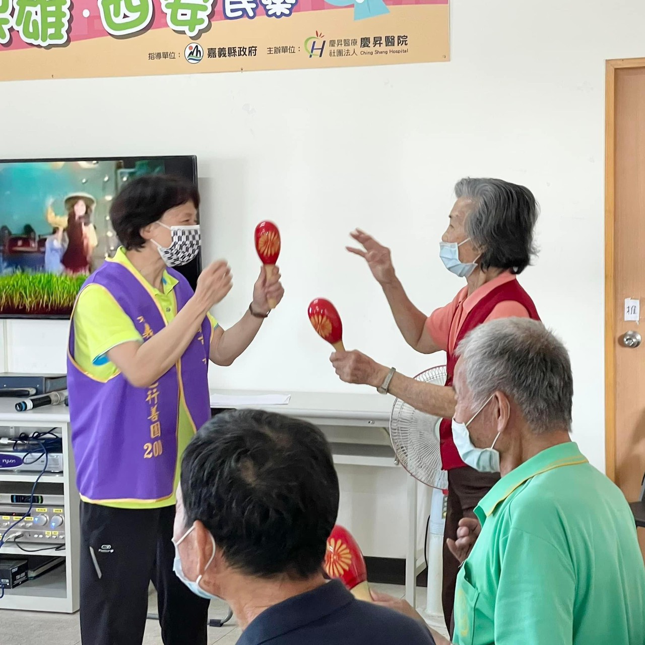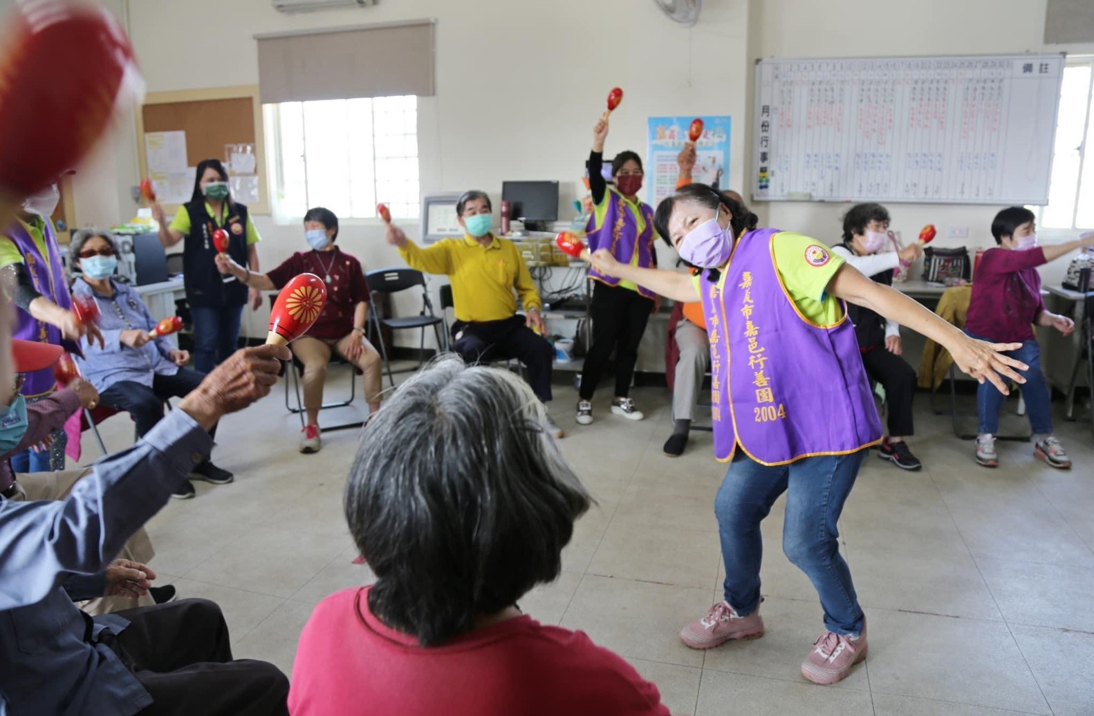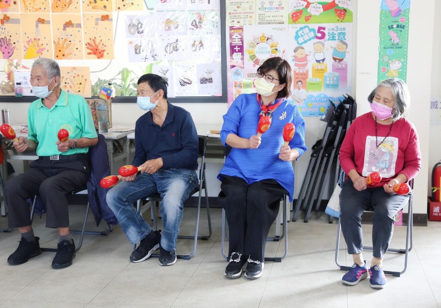 我們以輕快活潑的台灣民謠《四季謠》結合響木和沙鈴,帶動長輩鍛鍊肌力,這次由志工素珠老師及榮艶老師擔任團康指揮,活動進行中,我們不斷鼓勵阿公阿嬤可以更放開心胸表達自己的感受,一起享受團康運動的樂趣,不僅有益身體健康,又能延緩老化!