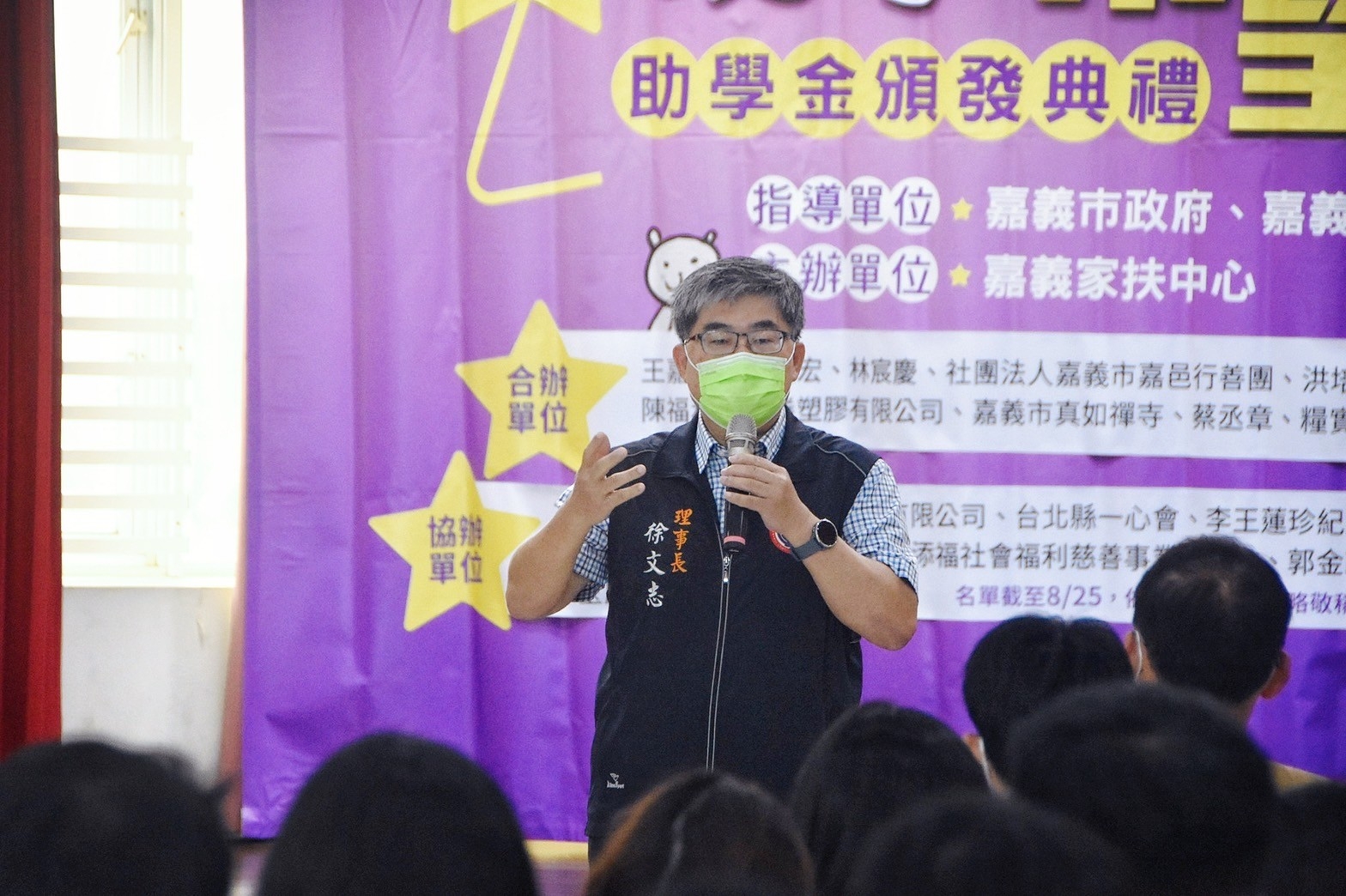 理事長徐文志深深感受到,其實在我們生活周遭,有許多需要幫助的對象,所以嘉邑行善團近年的善因種子計畫,就是致力扶助弱勢家庭的在學子女,使其能安心學習。理事長同時勉勵在場學子抱持持續學習的心,走出一條最適合自己的道路!