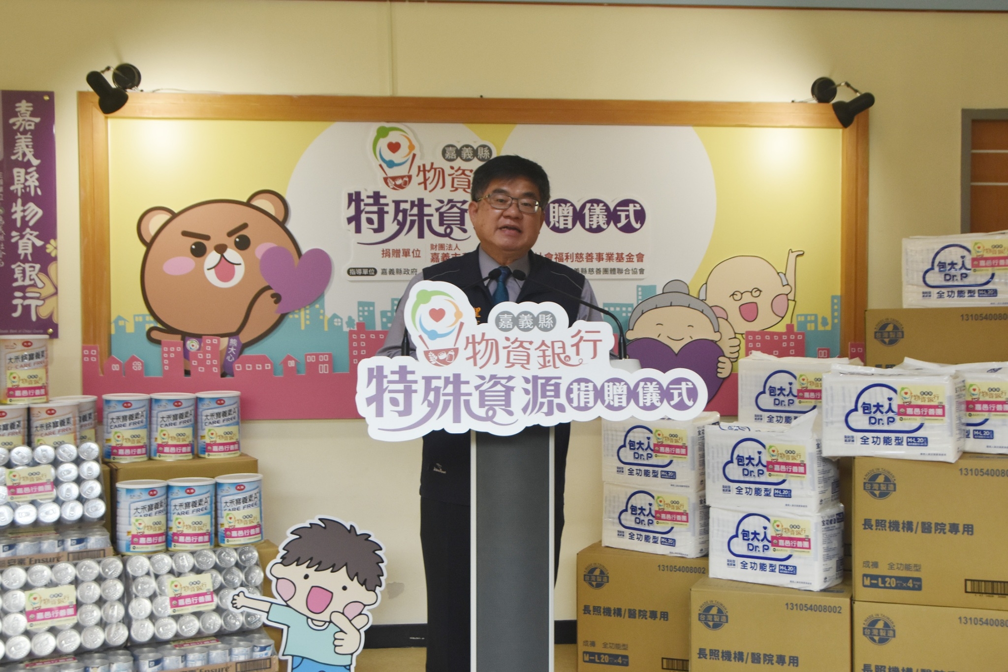 翁章梁縣長說,物資銀行成立至今已經12年,隨著醫療發達與生活水準提升,而致使漸漸有了特殊營養品補充身體狀況的需要。因此由委託單位嘉義縣社會局張翠瑤局長、社團法人嘉義縣慈善團體聯合協會呂文正理事長主持,持續透過物資銀行來關照這些受關懷戶的民眾。