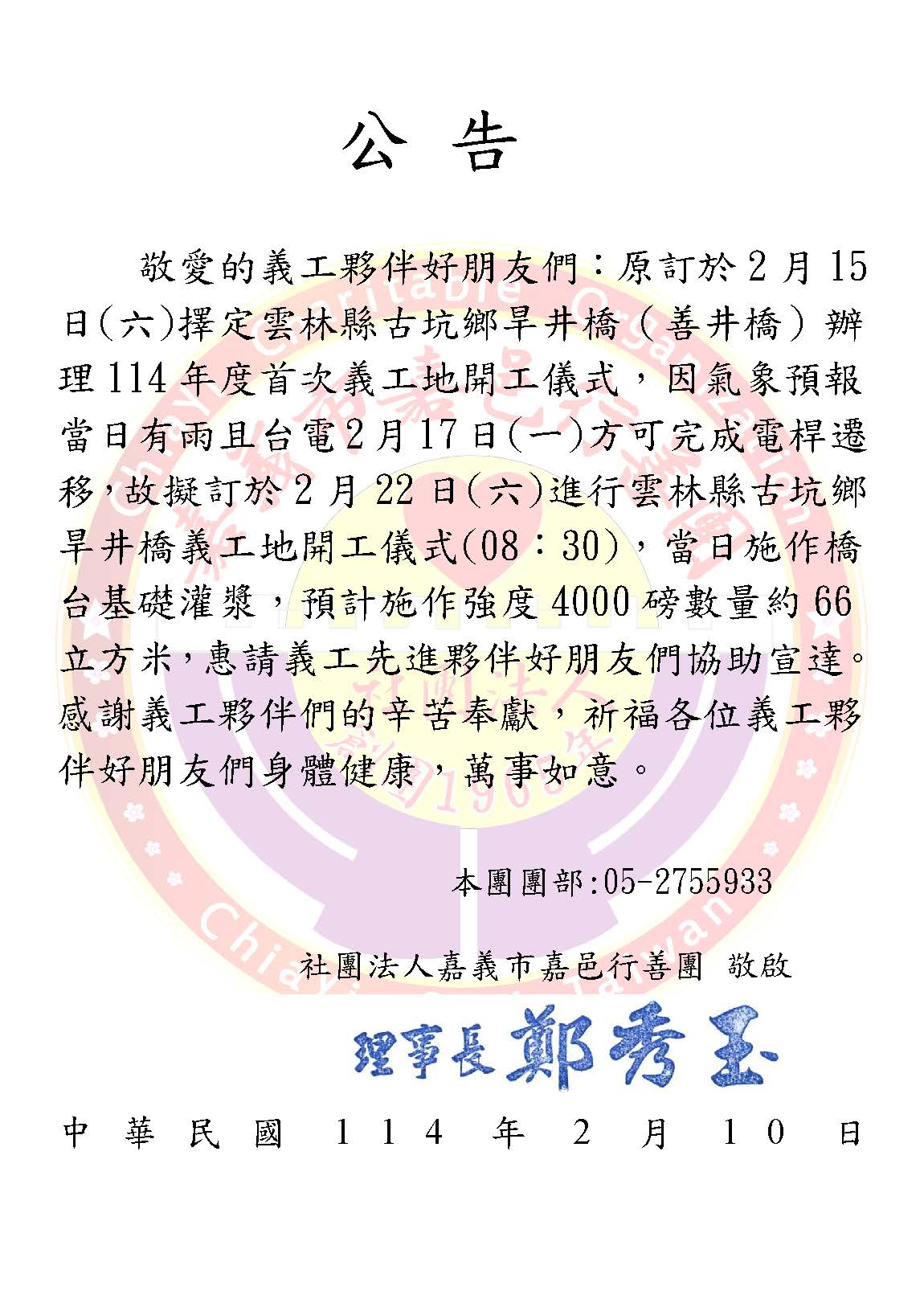 113年2月22日(六),年後造橋義工地將在古坑善井橋開工,請各位義工一同參與!!