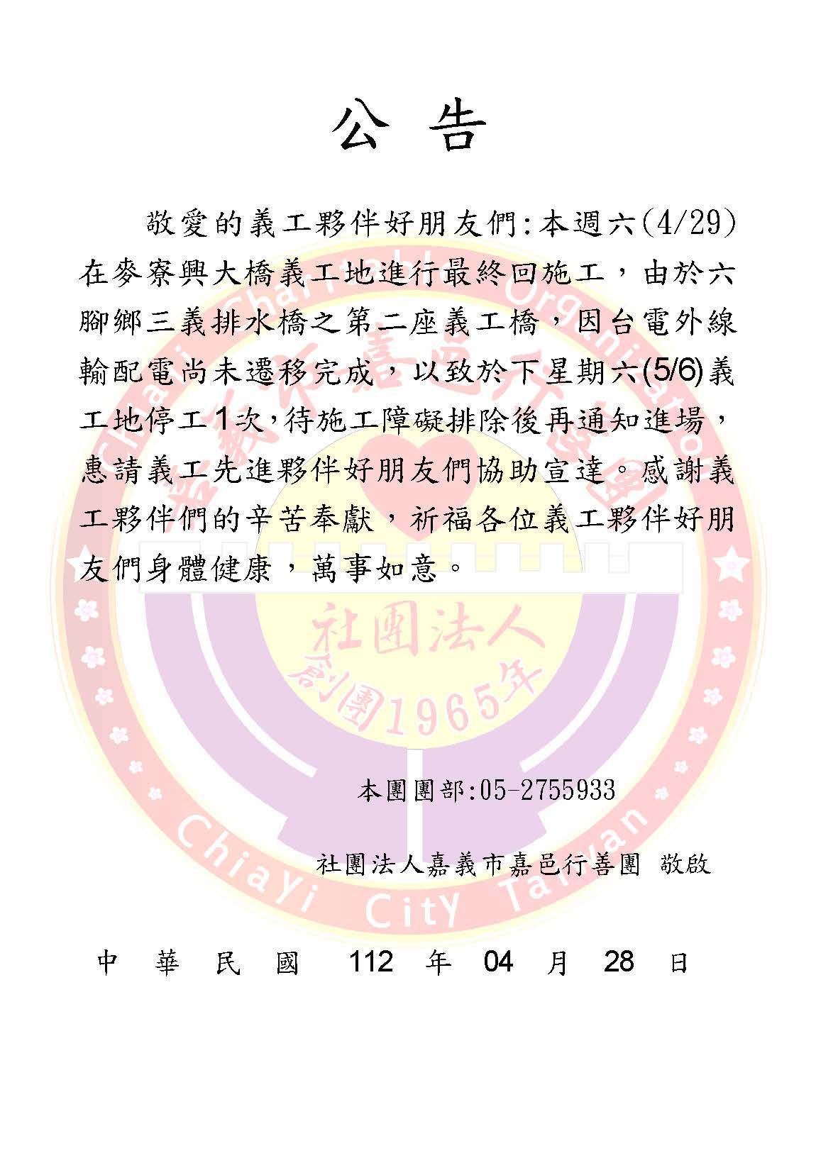 消息與活動 112年5月6日(星期六)造橋義工地暫停一次 發佈日期:2023-05-02 資料來源:嘉義市嘉邑行善團 瀏覽人數:1046 Gallery 義工工地因故停工1次 1120428.jpg 回上一頁