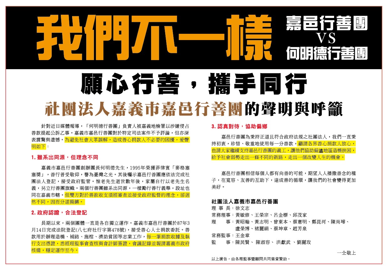 社團法人嘉義市嘉邑行善團再次聲明與呼籲