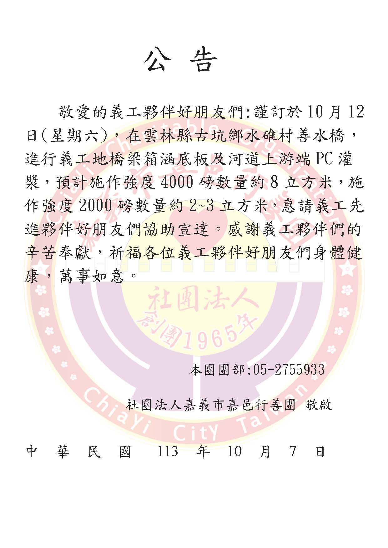 消息與活動 本月善水橋義工工地,將於10月12日舉行,歡迎所有的義工好夥伴一同來參與行善! 發佈日期:2024-10-08 資料來源:嘉義市嘉邑行善團 瀏覽人數:682 Gallery 公告1131012-義工地施工1131007.jpg 回上一頁