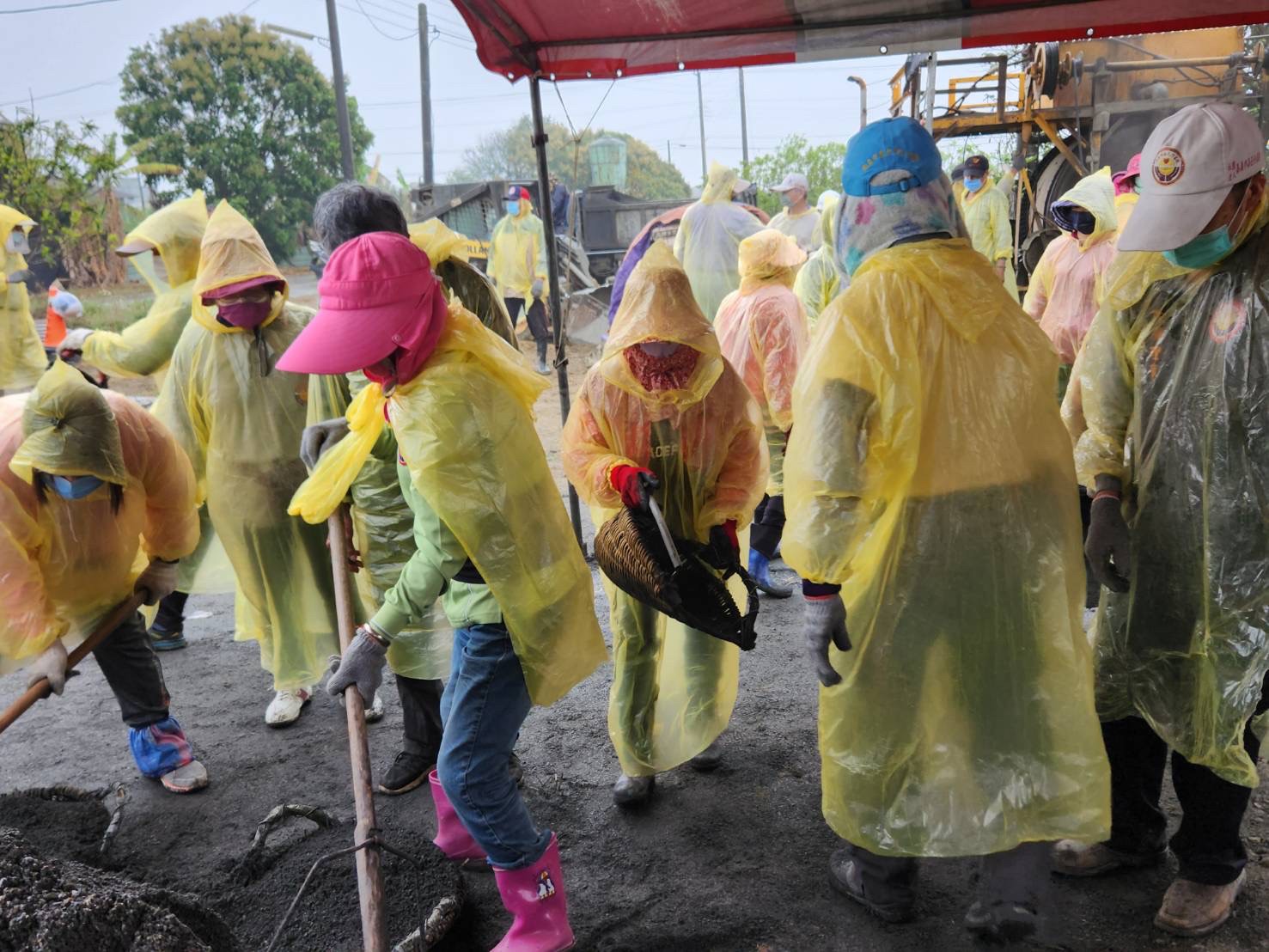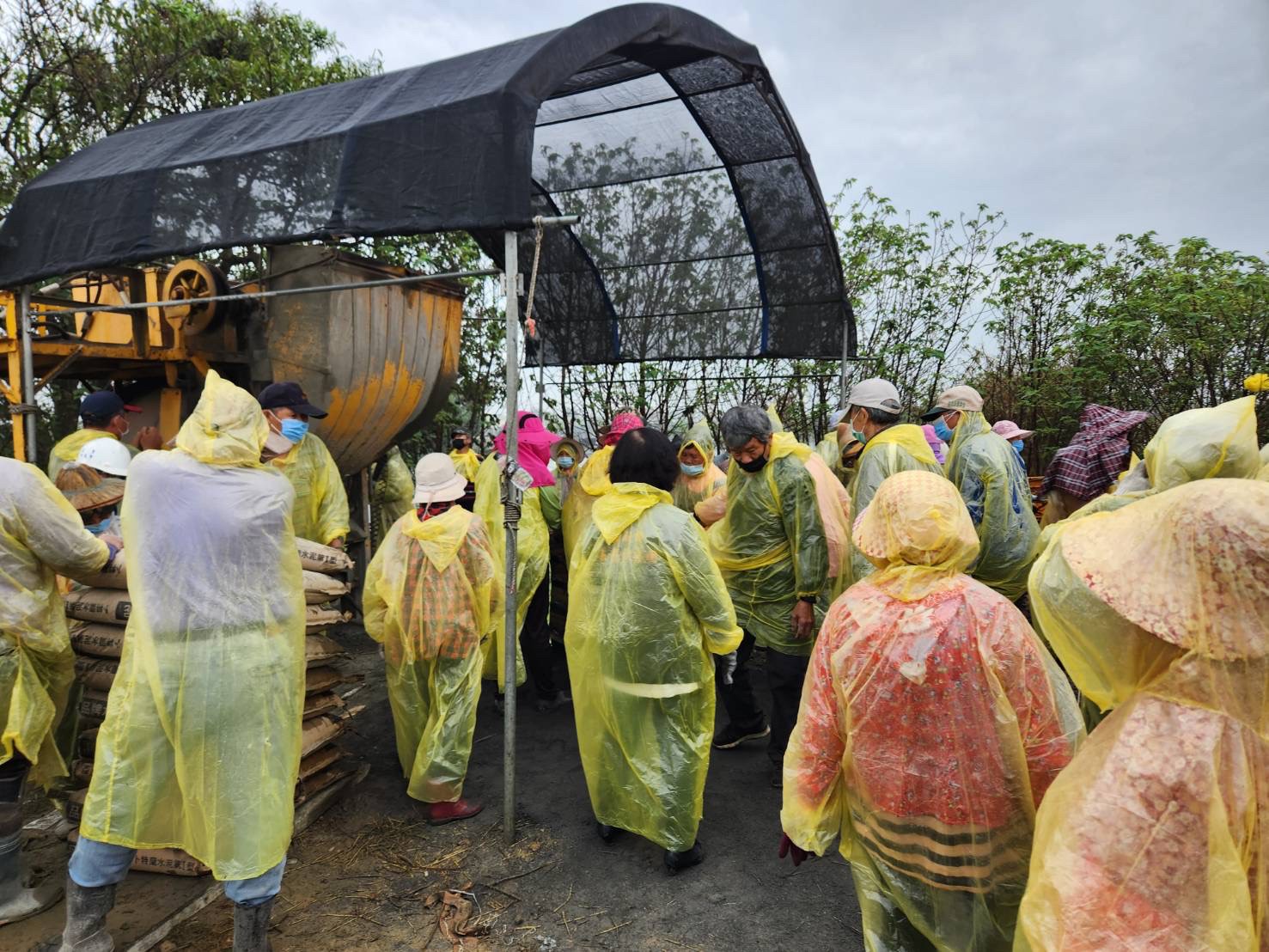 大家雖然被雨淋濕了,臉上依然掛著歡喜的微笑、齊心發善,溫暖彼此的心!
