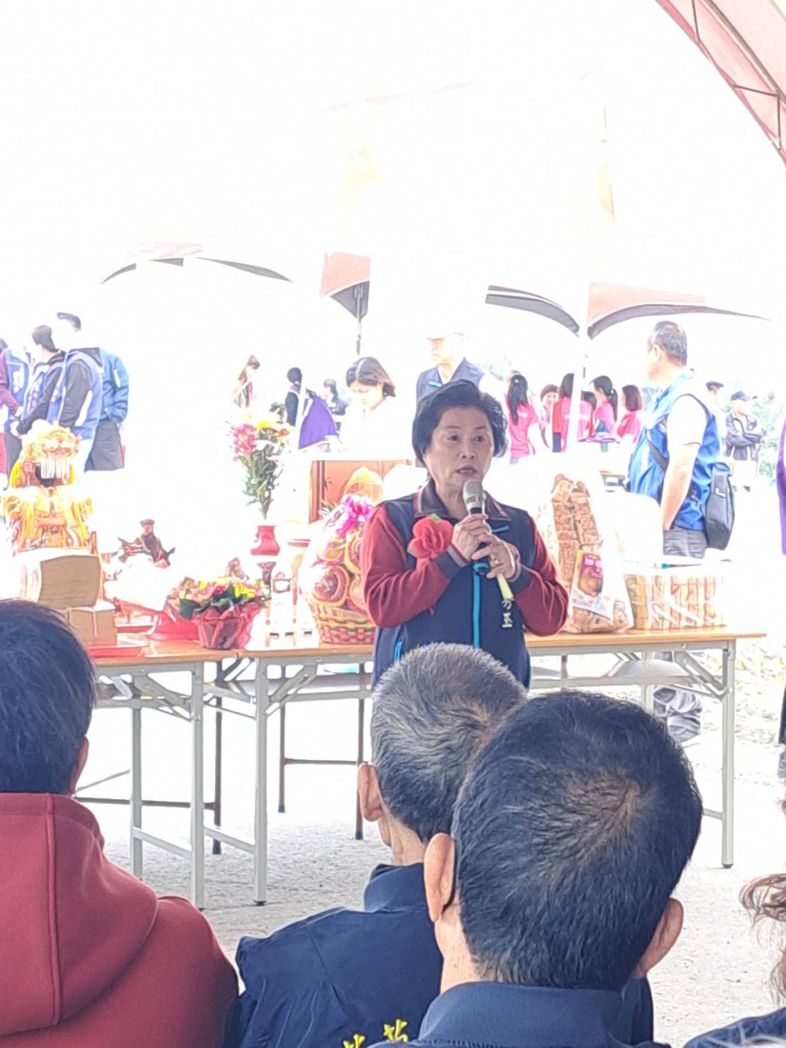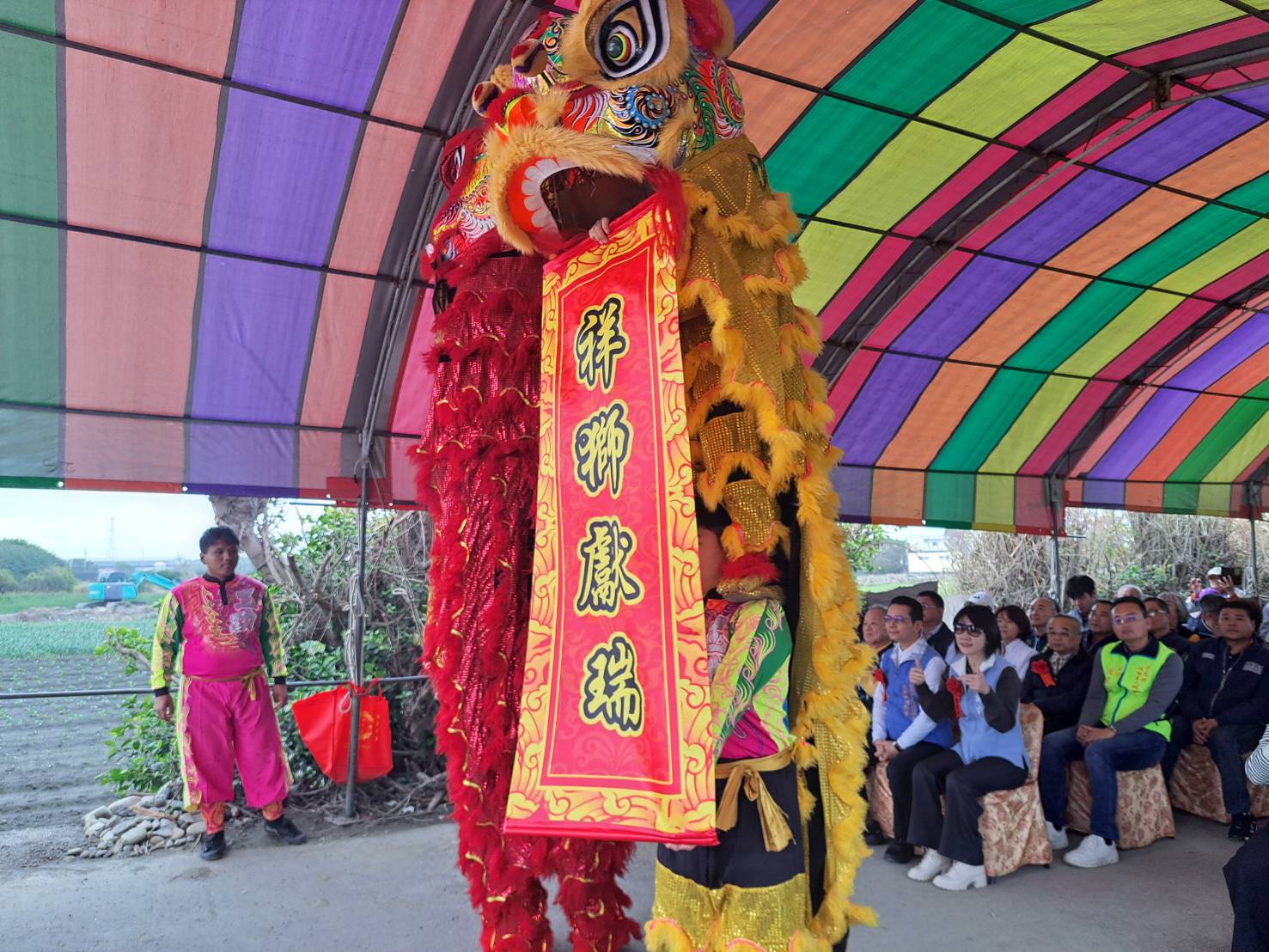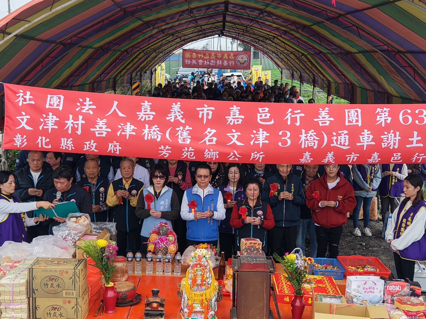 謝土儀式由本團鄭秀玉理事長及芳苑鄉林保玲鄉長一同主持,與會嘉賓有立委謝衣鳯、工策會洪榮章總幹事、芳苑鄉代表會主席陳禮模、議員洪騰明、吳淑娟及張國棟、芳苑農會總幹事謝介民、福海宮主委林義璿及村長、代表、地方人士及嘉邑行善團理監事、造橋義工、團務人員等出席見證這座「愛心之橋」的誕生。