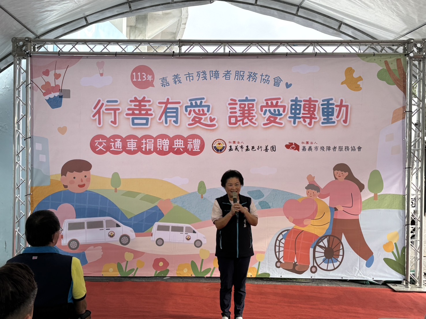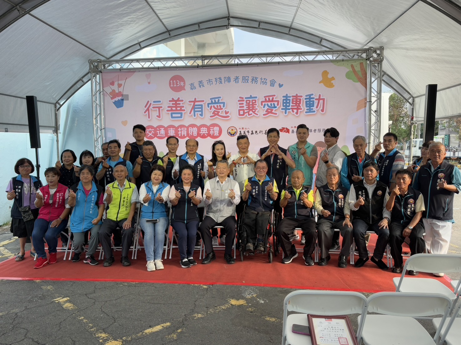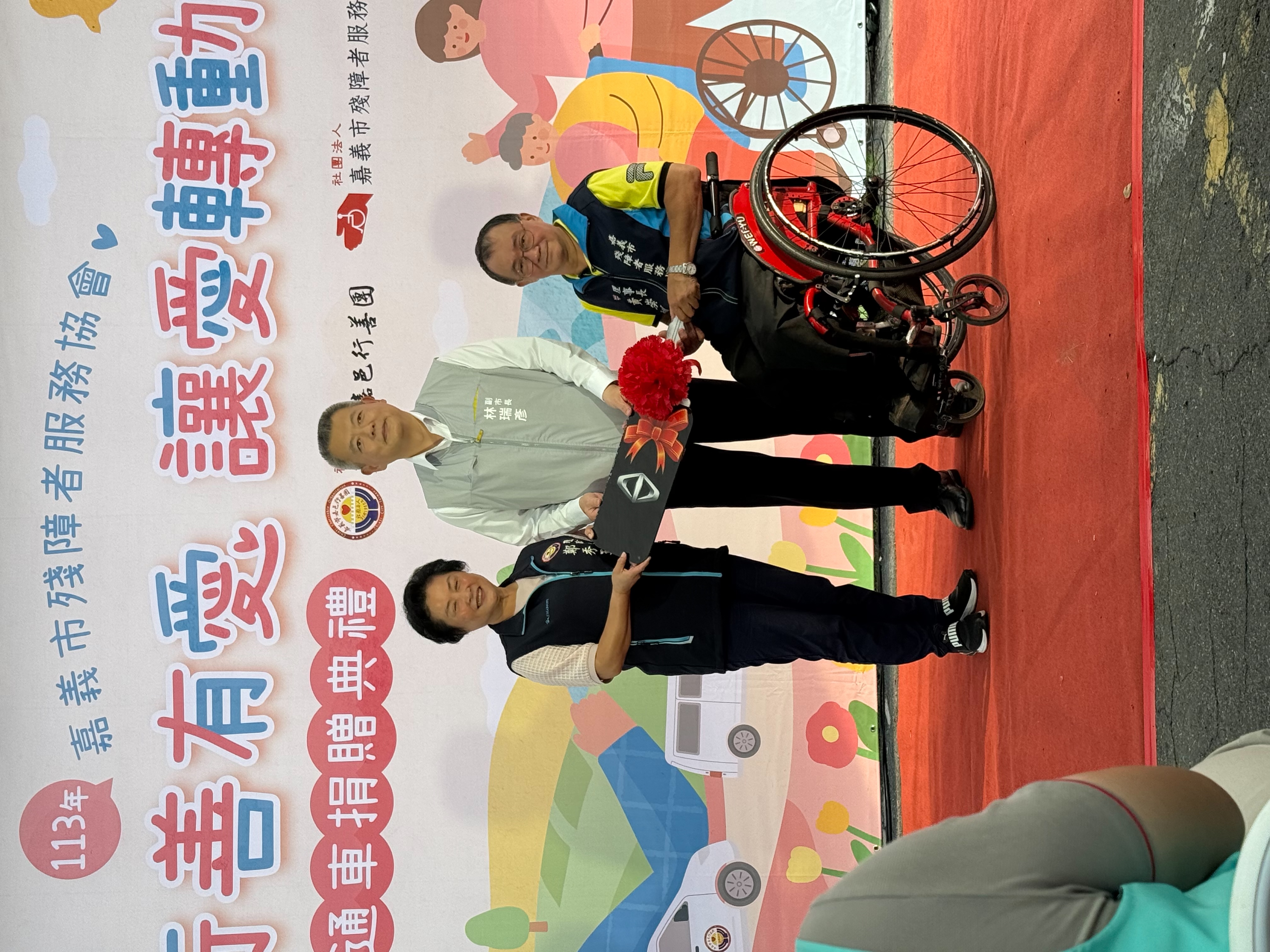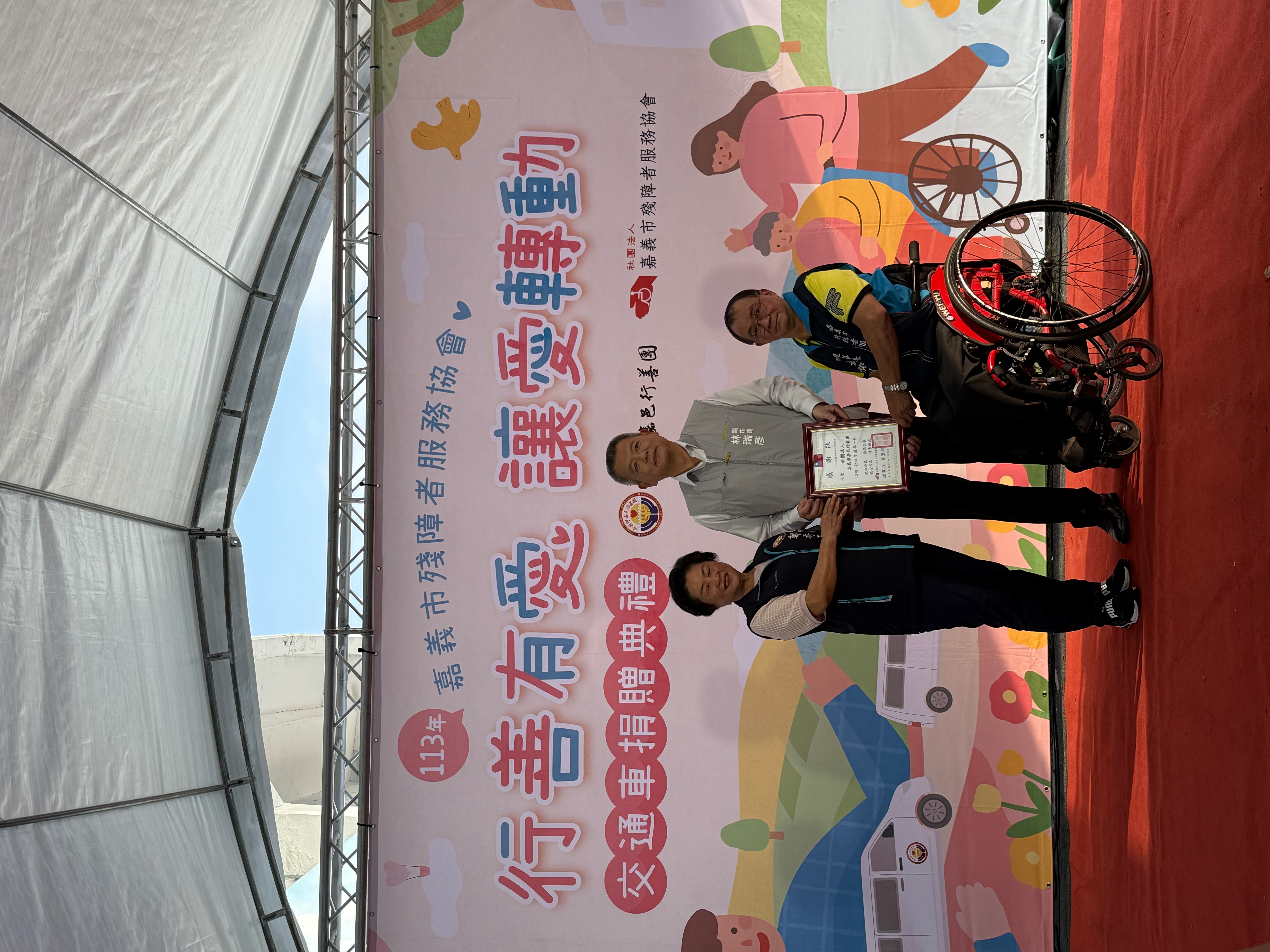 為了協助身障運動員移地外訓的交通運送,並鼓勵身障朋友多多參與運動競技,鄭秀玉理事長代表嘉邑行善團,捐贈社團法人嘉義市殘障者服務協會一部全新廂型車,在嘉義市林副市長見證下,由殘障協會黃理事長代表接受。